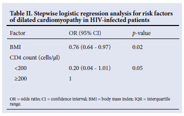 RESULTS: Seventeen cases of HIV-associated cardiomyopathy and a comparison group of 18 HIV-positive individuals without cardiomyopathy were studied. There was no significant difference between the two groups in age, gender, CD4 cell count, HIV RNA viral load or World Health Organization (WHO) clinical stage of HIV disease. Patients with HIV-associated cardiomyopathy had evidence of undernutrition compared with HIV-infected people without cardiomyopathy, as evidenced by a significantly lower body mass index (BMI) (20.9 kg/m2 v. 27.0 kg/m2, p=0.02), mid-upper arm circumference (26.2 cm v. 27.3 cm, p=0.02), and bone-free arm muscle area (26.7 cm2 v. 32.8 cm2, p=0.02). However, in a multivariate stepwise logistic regression model, a lower BMI was the only independent anthropometric risk factor for cardiomyopathy (odds ratio 0.76, 95% confidence interval 0.64 - 0.97, p=0.02).