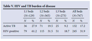 Overall, 245 (31.9%) patients had symptomatic HIV infection and a further 18 (2.3%) were suspected of being HIV-positive. A total of 61.2% of patients in L1 beds were HIV-positive (Table V); 132 (17.2%) had active tuberculosis, of whom 107 (81.1%) were admitted to L1 or L2 beds.