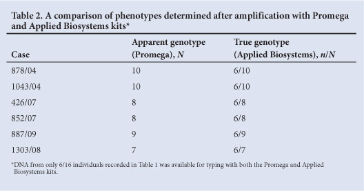 TPOX null alleles were only observed in samples from the black and coloured population. However, it is possible, although unlikely, that their apparent absence from the white and Indian groups is due to small sample sizes. The phenotypes of all apparent TPOX null allele carriers who were tested changed when they were retyped using an Applied Biosystems kit (Table 2). Each was apparently homozygous when typed with the Promega kit and heterozygous when typed with an Applied Biosystems kit. In addition, the uncovered or revealed allele was allele 6 in every case, which means that a subset of allele 6 in the black and coloured populations is linked to the primer binding site variant.