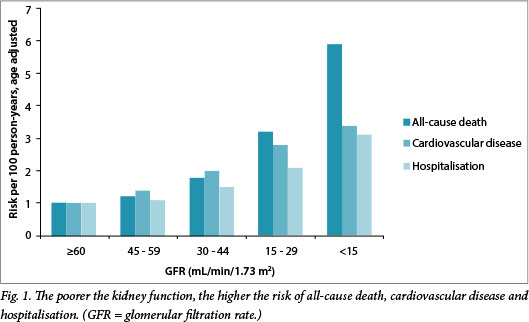 A decline in kidney function is an important risk factor for CVD. The poorer the kidney function, the higher the risk of CVD. Besides CVD, a large-scale epidemiological investigation revealed that relative risks for total mortality or hospitalisation rise irrespective of cause in proportion to the degree of reduction in kidney function (Fig. 1).[3]