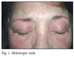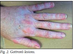Pathognomonic features are the heliotropic rash and Gottron's lesions. The heliotropic rash (Fig. 1) is characterised by peri-orbital swelling and violaceous discoloration. This may be very severe and conspicuous, or subtle and transient, and may have disappeared when the patient presents with weakness. Gottron's lesions (Fig. 2) are violaceous papules or scaly plaques on the extensor surfaces of the fingers, e.g. the knuckles.