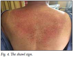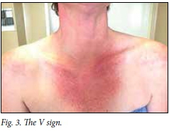 Very suspicious features include well-defined areas of erythematous swelling in a typical distribution, resulting in the V (Fig. 3) and shawl (Fig. 4) signs.