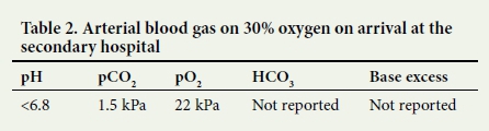 Infusions of 5% dextrose w/v and 0.5% sodium bicarbonate were initiated separately, and the patient was immediately transferred to a secondary level hospital. Ongoing hypoglycaemia and worsening tachypnoea, accompanied by a drop in Glascow Coma Scale (GCS) to 12/15, occurred en route and 50 ml of a 50% dextrose bolus was administered.
