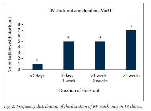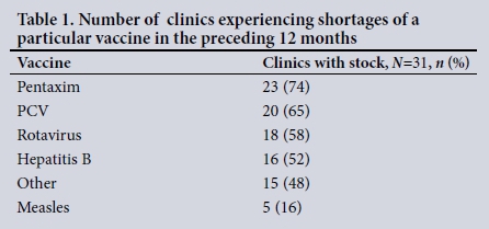 RESULTS. A total of 31 clinics participated. In the preceding 12 months, clinics had experienced vaccine stock-outs, especially of the three newer vaccines: pneumococcal conjugate vaccine, rotavirus and Pentaxim. These were also out of stock for a long duration; for over 2 weeks in a majority of clinics. The causes of vaccine stock-outs were: poor management of stock, district depot out of stock, unreliable deliveries, lack of pharmacy assistants and limited fridge capacity. Further burdening the situation is the ineffective emergency-ordering system.
