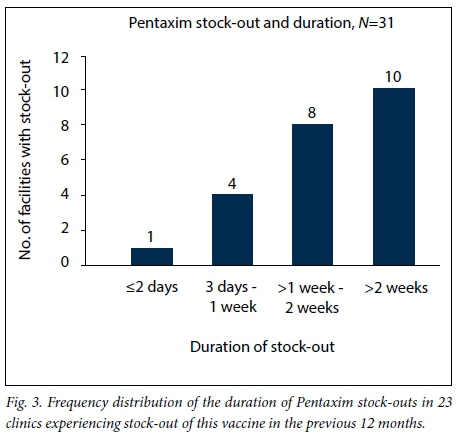 All clinics had experienced a shortage of at least one vaccine in the preceding 12 months. Vaccine shortages lasted from <2 days to >2 weeks (Figs 1 - 3).