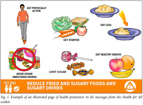 The NDoH requested that the appearance of the toolkit reflect other guidelines already in use in primary care. Additionally, the toolkit would stand on the desk with a page of detailed informative text facing the provider and a page of illustrated messages facing the patient for each risk and condition. Premised on individuals' limited capacity to recall information and comply with only a limited number of resolutions,[14] five actionable ('to do') messages would be linked to each risk and condition. Healthcare providers would be encouraged to present a maximum of two 'to do' messages to a patient for their consideration. Illustrations would be used to depict all the included health promotion messages and would be culturally sensitive to improve comprehension and recall of messages.[15] The development team contracted a graphic designer familiar with the healthcare setting to conceptualise and produce the appearance and illustrations within a typical SA local community thematic.
