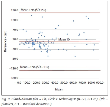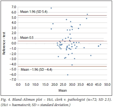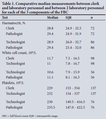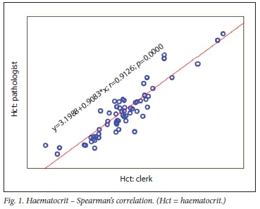 RESULTS. There were 72 comparisons for haematocrit (Hct), 98 for white cell count (WCC) and 137 for platelets (Pit) between the clerk and laboratory personnel. The correlations were 0.91, 0.96 and 0.92, respectively. All were statistically significant. Using the Bland-Altman method, there was good agreement between results of the clerk and those of the laboratory staff, with a mean bias of 0.5% (Hct), 0.1 χ 109/L (WCC) and 10 χ 109/L (Pit). An insufficient number of tests were performed by medical doctors for statistical comparison.
