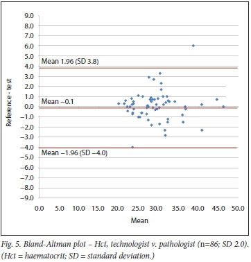 With regard to Hct, the Siemens RAPIDPoint (Siemens, Germany) POC system demonstrated a bias of -1.1 compared with the reference value.[9] In this study, nurses who were trained on the rapid point system performed the test in critically ill patients. Another POC instrument, the haemocytometer, was evaluated in an intensive care setting.[10] Clinical staff were trained to use this instrument and observed the bias of Hct against the reference of 0.51. A study comparing the Hemoscreen (Pixcell Medical, Israel) POC instrument in a research setting, using a combination of flow cytometry and digital imaging, included testing for user friendliness by 6 lay people. However, these users did not perform the testing for the main comparison. All cell counts including Hct and Hb (excluding differential counts) had correlations >0.92.[1l] A recent study in critically ill patients comparing a non-invasive POC pulse co-oximetry Hb/Hct to the reference method found a mean bias of 1.64.[12] Overall, our study bias of -0.5 for Hct (clerk v. laboratory personnel) compares favourably with other POC comparisons in the literature.