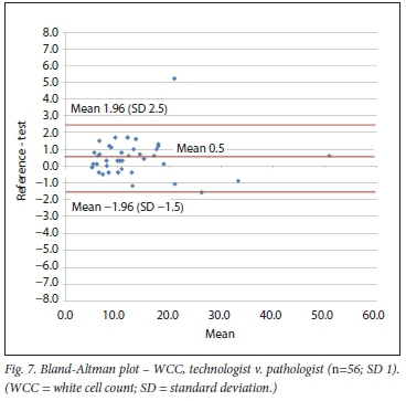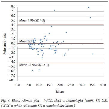 Relevant data on WCC comparisons are sparse. The HemoCue system (HemoCue, SA), based on microscopical image detection (photomicroscope), is a POC system for WCC. Evaluation outside of a critical care setting revealed a difference of < 10% from the reference for 96% of the samples.[13] Our study bias for WCC (clerk v. laboratory personnel) was +0.1. This translates into a <1% difference for a WCC at the threshold value of 12 χ 10VL, indicating comparative results between clerk and laboratory personnel.