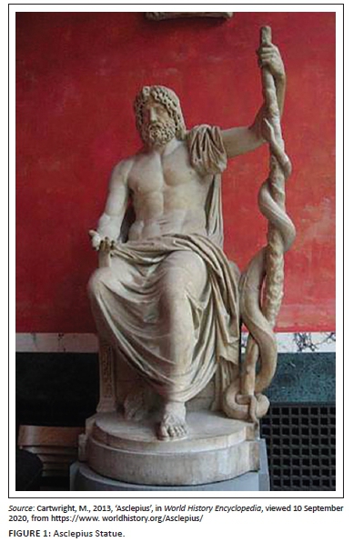 Pausanias (circa 110-180 CE), a Greek traveller and geographer in his article Description of Greece (2:27.2) describes the image of Asclepius (shown in Figure 1) as that of '[t]he god … sitting on a seat grasping a staff; the other hand he is holding above the head of the serpent' (Crane 2013). This description reveals Asclepius mystical healing powers symbolised and associated with a snake, and a staff. Farnell's observations that earliest tradition of Homer and Hesiod present Asclepius as 'a typical man-god', a real physician of prehistoric era, who was worshipped with historic honours after death and was gradually apotheosized (Farnell 1921:235-238) points to a tradition of healing predicated on mystical power of the divinised Asclepius. This healing power was communicated through a snake as a medium that physically mingled with the sick who would be sleeping in a sanctuary anticipating for Asclepius to appear (to the sick person) in a dream in order for the priest to prescribe the medication to the sick person by interpreting the dream (Farnell 1921:238-242; Pachis 2016:3; Wilson 2014:30).