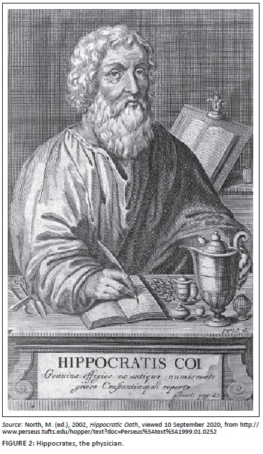On the one hand, Jouanna (1999) noted that in his The Sacred Disease, Hippocrates (shown in Figure 2) disputed divine origin of epilepsy and other diseases to advocate for clinical observations, diagnosis, and prognosis, and argued that specific diseases come from specific causes. On the other hand, in the so called 'Hippocratic Oath', a comparison between the opening statement 'I swear by Apollo the physician, and Asclepius' and the claim that 'I will use those dietary regimens which will benefit my patients according to my…judgments' (Philastratus, Hippocratic Oath. Hp. Jusj.1) collectively portrays an overlap between professional and cultic sector. Glessner correctly notes that although professional medicine was influenced by methods and practices of Hippocrates, most of its activities were carried out in the sanctuaries of Asclepius whereby the Asclepius cult blended 'herbal formulae and medicinal application intrinsically connected with cultic rituals and worship' (Glessner 2017:20). This overlap of the cultic and professional health sector in Hippocrates' practice of medicine not only reveals Hippocrates' allegiance to Asclepius, but also shows his regard for the natural cause of diseases and his use of mediums to effect healing.