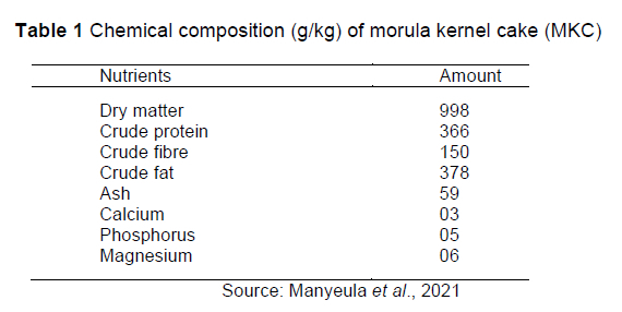 In Botswana, the most common protein source for broilers in the commercial ration is SBM. The SBM is exotic to Botswana, hence it is expensive for farmers. Therefore, it is imperative to seek an alternative source of protein that would match SBM's nutritional composition and utilisation. One of the possible substitutes of SBM is morula kernel cake (MKC), which is a by-product of oil extraction from the dry seeds of the ripe morula fruit (Nyoka et al., 2015). Morula (Scíerocarya birrea) is an indigenous fruit tree distributed throughout most of sub-Saharan Africa (SSA). The fruits, which ripen between December and March, have a light-yellow skin (exocarp), with white flesh (mesocarp). The morula fruit is climacteric; they fall to the ground when unripe (i.e., when fruits are green), and ripen to a yellow colour on the ground after a few days. The fruit is a drupe with a single seed encased within the endocarp; morula fruit can have up to four seeds. They are succulent and tart with a strong and distinctive flavour (Mukaro, 2014). Inside is a walnut-sized, thick-walled stone (endocarp). The MKC is a novel, locally available, low-cost alternative protein supplement for livestock and poultry.