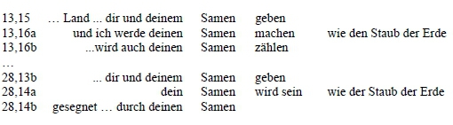 Augenscheinlich enthält der jetzige Text mehrere Momente, welche die Gottesreden in 13,14-16 / 28,13-15 miteinander verbinden.