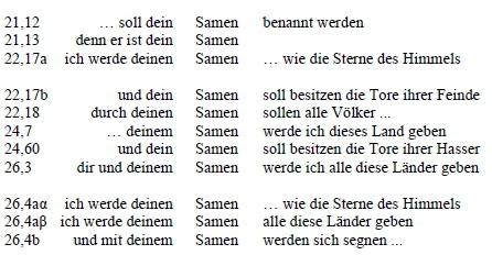 Der zentrale Text der 47-teiligen Tabelle lautet: ,,JHWH, der Gott des Himmels ... der zu mir geredet und mir geschworen hat, ,deinem Samen werde ich dieses Land geben'.. ,"82 (24,7). Die einzige als Schwur formulierte Landverheißung, in der sich der Empfänger expressis verbis auf Gottes eidliche Zusage beruft, steht im Mittelpunkt. Die prononcierte Positionierung und die Tatsache, dass Gen 24 nahtlos in jede ,,Samen"-Struktur eingebunden ist, stellen die Hypothese, Gen 24 sei ,,in den bereits priesterlich edierten *Pentateuch"83eingeschrieben, ernsthaft infrage. Die Tabelle betont einerseits die Interde-pendenz der Verheißungsreden in 22,15-18 und 26,3b-5, andrerseits wird Gen 24,7 durch die Textgestaltung zum Herzstück, denn die als Schwur formulierte Landverheißung steht im Zentrum.