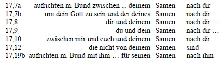 Die gewichtige theologische Wahrheit, die unverbrüchliche Bundeszusage Gottes für Abraham und Isaak, wird in doppelter Hinsicht struktural unterstrichen, einmal im Kapitel per se und zweitens geben Gen 17,7a und Gen 17,19b der gesamten Abrahamgeschichte theologische Signifikanz. Bei der 25-teilige Tabelle, die aus p-Texten und np-Texten besteht, vernimmt man gewissermaßen einen einzigartigen, einen harmonischen ,,Einklang."92