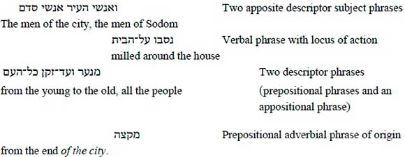 This scene opens with the uninvited visit of Sodom's townsmen to Lot's house. The narrator says they were encircling the house (the implication of 220 in the niphal stem v. 4), presaging their aimless wandering around the house when they would be blinded later by the angels. YHWH had told Abraham he would be visiting Sodom to confirm its wickedness. Here, the narrator relates the total corruption of Sodom in the way he reports the visit to Lot's house in this parallelistic structure below. Put differently, there are four descriptor subject phrases with accent on the domiciliary city (the men of Sodom) and the breadth of the people involved (all the people: young and old). The verbal phrase specifies their activity (encircling Lot's house) and the prepositional locative adverbial phrase specified where they came from (every end of the city). In other words, the entire city was represented and no part was left behind.