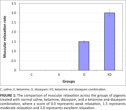 The pigeons were allocated randomly to four equal groups of eight birds each. The groups were differentiated as follows: in group D, diazepam was administered at a dose of 0.2 mg/kg, in group K, ketamine 5% was administered at a dose of 30 mg/kg, in group KD, a ketamine (5%) and diazepam combination was administered at a dose of 10 mg/kg and 0.2 mg/kg, respectively, whilst in group C (control), a 0.5 mL dose of normal saline was given per bird.