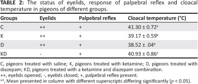 There were significant differences in eyelid status between group KD and groups C, D and K (p < 0.05). The eyelids of pigeons treated with the ketamine and diazepam combination were completely closed. With ketamine alone, the pigeons' eyes were completely open during anaesthesia (Table 2). There were no significant differences in the palpebral reflexes in the different groups and these were present in all the groups (Table 2). The cloacal temperature was 41.30 °C ± 0.72 °C before medication. When measured 10 min after drug administration in groups K and D, the cloacal temperature was recorded to have decreased significantly (p< 0.05). However, in pigeons from group KD, the cloacal temperature remained within the initial range, measuring at 40.93 °C ± 0.86 °C (Table 2).