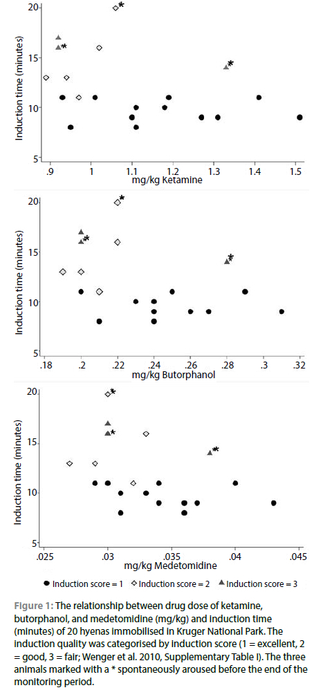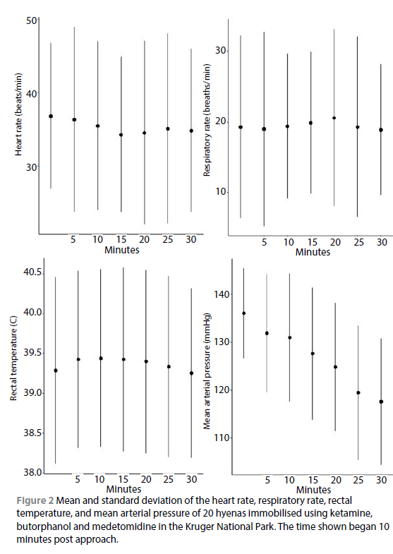 Limitations of the study included variability in weight estimates, amount of food the hyena consumed before being immobilised, dart placement, and differences in the individual stress level of the animals. However, such variability is inherent when immobilising free-ranging animals that cannot be weighed or starved before the immobilisation.