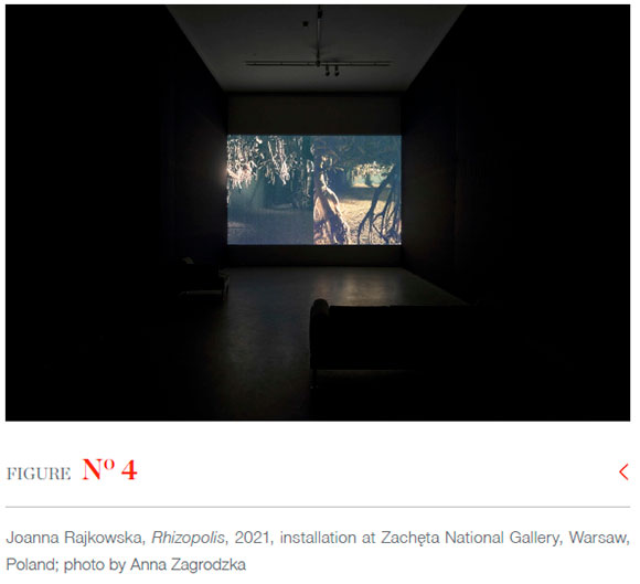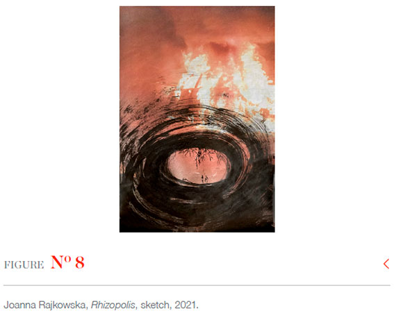 The imagined space no longer seems speculative and distant in the context of the pandemic and the brutal attack of Russia on Ukraine.5 Rhizopolis generates a scenario for survival in the face of a collapse of a world. Rajkowska says Rhizopolis is a stage, an installation and a complex network of connections in the biosphere offering survival. The artist explains that, although difficult to visualise, it is her proposal for a 'radical dependence', in which nature is no longer dominated by humans and transpires to be a kind and generous refugium sustaining its predators, us (in Zajaczkowska & Rajkowska 2021). In ecological literature, refugia are articulated in the context of climate crisis as areas relatively buffered from climate change.
