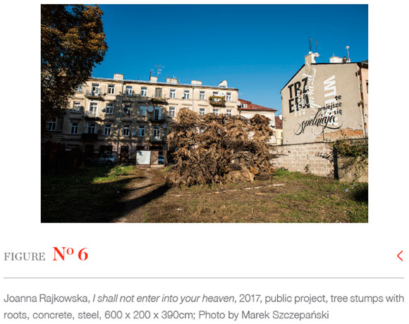 Before conceiving Rhizopolis the artist worked on another public project, I shall not enter into your heaven (2017), a wall created in Lublin from 22 tree roots, collected from logging fields, stacked in six joined columns (see Figure 6). The installation reflected the painful and traumatic experience of visiting the logging sites in Poland (see Figure 7). Initially, Rajkowska thought about a stack of stumps to counter a modernist monument, specifically Constantin Brâncusi's wooden columns (Endless Column, version 1, created in 1918). Finally, she decided upon a barricade installed in a densely built-up area near Teatr Powszechny in Lublin. With time, she learnt to recognise individual trees, and know their shapes and smells (Rajkowska 2023). They were no longer objects to build from but persons, each with a distinct energy, to build with.