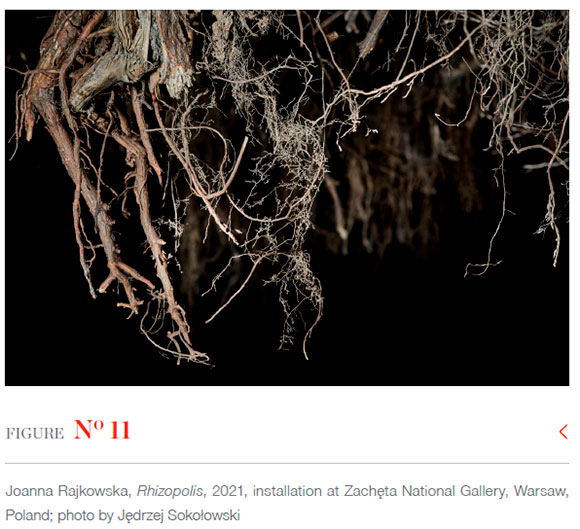 Rhizopolis portraying the remnants of post-apocalypse seems no longer fictitious. No trees were cut down for the installation created from excavated stumps. For over a year, Rajkowska and Urszula Zajaczkowska, a botanist and author of books including Patyki, badyle (Sticks, stems, 2019), visited logging fields in predominantly pine forests. Stumps of coniferous trees turned out to be monumental; too long and heavy for the installation envisaged for Zacheta. Hence, roots of younger trees were used, sourced from a dump nearby Warsaw for roots cleared from construction sites (see Figure 2). Rajkowska salvaged stumps from being chipped and burnt down in furnaces to create a space of co-nutrition and co-habitat.