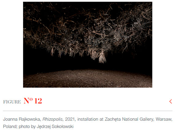 Like Ono, Joanna Rajkowska, a Polish artist working across diverse media and materialities, imagines a future habitat on earth, but unlike Ono, Rajkowska does not provide conceptual instructions for reflection. Instead, she invites us to immerse ourselves in an environment created from tree stumps and their roots, a futuristic scenography for a non-existent science fiction film. Rhizopolis (2021), a set design she built for display at Zacheta National Gallery of Art in Warsaw, Poland, was conceived as an underground shelter for surviving species of a series of envisioned cataclysms.2 Life on the earth's surface is no longer possible through which we co-imagine a potential future and an alternative habitat generating caring co-dependencies within our planetary multispecies community.