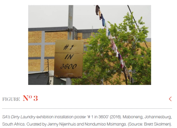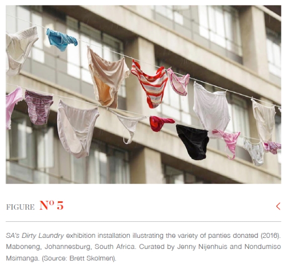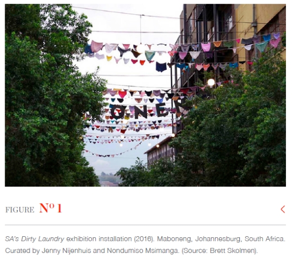 Towards the end of 2016, thousands of used panties lined the sky in Johannesburg's Maboneng precinct, as a 1.2-kilometre-long washing line was installed between Fox, Albrecht, and Kruger streets (see Figure 1). The washing line contained 3600 items of underwear strung together. At first glance, these strings of small, colourful clothing could, to the inattentive mind, resemble bunting flags and evoke a sense of celebration. Only on closer inspection would the viewer notice the peculiarity of the suspended items on a washing line, exposed for all to see.
