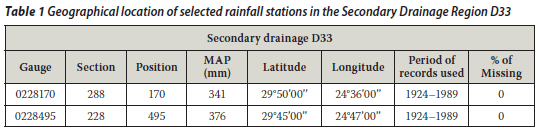 The annual rainfall totals for the Bleskop station (SAWS gauge no 02284170) and the Luckhoff-Pol station (SAWS gauge no 0228495) were considered for this preliminary study to test the performance of the two techniques, i.e. standard BP and generalised BP. (These two rainfall stations were selected randomly.) These rainfall stations are about 20 km apart and belong to the secondary drainage region named D33 of the Orange River Drainage System (D) of South Africa. The monthly rainfall data were obtained from the report by Midgley et al (1994). The geographical location and other characteristics of the selected rainfall stations located in the summer rainfall zone are listed in Tables 1 and 2.