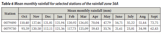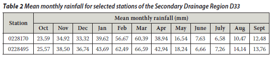 Gauge 0228495 (Luckhoff-Pol) was taken as the target gauge and gauge 0228170 (Bleskop) as the control gauge. Gauge 0228170 was chosen as the control since it gave better results during trials of the estimation of missing values at gauge 0228495 than when gauge 0228495 was considered to fill in the missing values at gauge 0228170. The mean monthly rainfall information listed in Table 2 was obtained by multiplying the MAP (in mm) by the monthly rainfall as a percentage of MAP since this was drawn from the Water Research Report WRC 298/3.1/94. (The computer programme HDY08 output is a monthly time-series, expressed as a percentage of MAP, and is representative of the rainfall zone.)