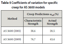 Table 5 shows the overall coefficients of variation for creep predictions by both the AS 3600 (2001) and the AS 3600 (2009) models, using characteristic compressive strength (as prescribed by these models) and actual compressive strength (as proposed by the author).