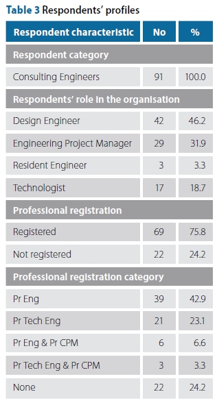 The target population for data collection was civil engineers working in firms that are members of Consulting Engineers South Africa (CESA). On civil engineering projects, the civil engineers often perform the functions of design, project management and construction supervision. They are therefore well positioned to comment on the various aspects of design documentation. CESA is the leading umbrella organisation for consulting engineers, and its membership database is publicly accessible (CESA 2017). Firms operating in Gauteng, KwaZulu-Natal and Western Cape provinces were selected from the database. The selection of provinces was based on the fact that a significant amount of the construction activity in South Africa takes place in these provinces.