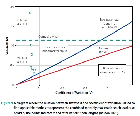 The monthly maxima combined for two opposite travel directions, representing the extreme traffic load effects for the critical spine beam, are modelled and assessed similarly to the RCS. Figure 9 illustrates the characteristics of each load case and relates the sample skewness to the coefficient of variation. It is observed that the sample skewness varies considerably, which can be conveniently captured by the LN3 distribution. Consistently with the RCS, the use of the Weibull distribution is avoided, as the fixed upper bound is deemed to be unjustified. As only extracted load effects were available for this project, it is impossible to determine the cause of the high skewness for the single-load effect situated in the Frechet domain.