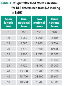 The design values of traffic load effects, ed, for each scenario given in Table 3 represent the rounded maximum obtained bending moments according to TMH7 NA loading for the midspan of a beam when designing for one, two and three notional lanes. It is important to note that dynamic effects are excluded from the NA load model based on the Swiss formula, and the ULS partial factor Yf= 1.65 is obtained as a product of YfL= 1.5 and yf3= 1.1. The calculated reliability indices β for each span length are given in Table 4.