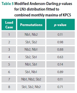 The modified AD test results are summarised in Table 5. Nb1 and Nb2 respectively refer to the slow lane and fast lane in the northbound direction. The same reference is made for Sb1 and Sb2 in the southbound direction. The traffic lane combinations for each load case are described in Table 5, where the traffic lanes are ordered from left to right in accordance to the closest and furthest traffic lane from the critical spine beam. It shows the recorded traffic used in each of the considered lanes. The _p-value for each load case exceeds a significance level of 0.05, which confirms that the LN3 distribution can be used to represent the combined monthly maxima.