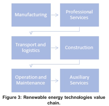 SMMEs have a key role to play in any industry, as they have the ability to contribute to job creation and growing the economy of the country. However, due to limitations on resources, skill and know-how, they are limited to certain areas of the value chain. The renewable energy value chain comprises manufacturing, professional services, transportation and logistics, construction, operation and maintenance and auxiliary services (see Figure 3).