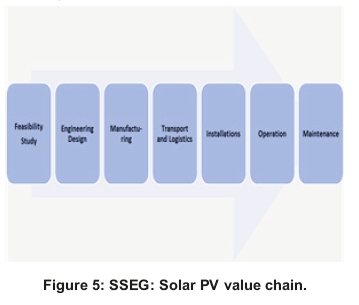 In the value chain of solar PV technology in SSEG, SMME participation is low, due to the capital-intensive nature of the industry. However, participation takes place in the provision of various services including construction, maintenance, design etc. Components are imported and assembled in the country.