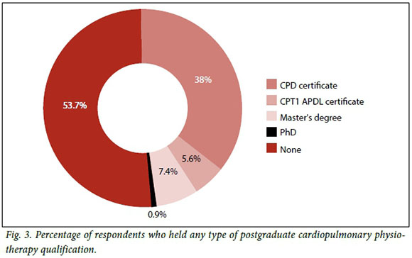 Physiotherapists working in private sector hospitals made up 60.2% (n=65) of respondents. Responses were received from physiotherapists in all the SA provinces with the exception of Limpopo Province (Fig. 1). A large number of respondents (n=51, 47.2%) were from Gauteng. The majority of respondents worked in medical, surgical or combined medico-surgical ICUs (Fig. 2). Fifty-six respondents (46%) held a postgraduate qualification related to cardiopulmonary physiotherapy (Fig. 3). In most cases, respondents indicated that patients in ICU were referred for physiotherapy by doctors or nurses (n=59, 54%); however, some reported that the physiotherapist working in the unit screened the patients to determine if they were suitable for physiotherapy intervention (n=49, 45%). An after-hours physiotherapy service was provided by 72% (n=78) of respondents to ICUs during weekdays. The majority of respondents (n=105, 97%) provided weekend physiotherapy services to their ICUs.
