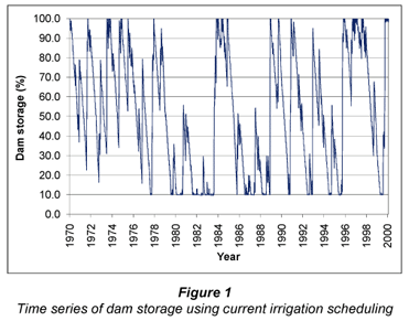 The land cover of a hypothetical 200 km2 catchment was assumed to be veld in good condition. Daily values of maximum and minimum temperature, relative humidity, rainfall, and radiation data from Pongola (27º24'S, 31º18'E) were used to represent the climate of the catchment. The soil type, assumed to be uniform throughout the catchment, was a sandy clay loam with a depth of 0.75 m. Stormflow and baseflow generated by this catchment flow were assumed to flow into a dam constructed at the outlet of the catchment. The dam was assumed to have a capacity of 14 000 000 m3 with a dead storage of 10% of the full supply capacity. This dam was assumed to supply water to an 800 ha irrigation scheme located outside of the catchment. No other abstractions from the dam were assumed. Thus, although the dam was at the outlet of the catchment, the position of the irrigated area was such that stormflow and baseflow generated by the irrigated area did not return to the dam. The soil in the irrigated area was also assumed to be a sandy clay loam with a depth of 1.2 m. The entire 800 ha of irrigation is assumed to be planted to sugarcane with a row spacing of 1.5 m. It was assumed that once the sugarcane had been planted it was harvested for a further 6 ratoons before being replanted. The sugarcane was assumed to be irrigated with a dragline sprinkler system, using fixed summer and winter cycles to irrigate, viz.: 48 mm each week in summer, and 48 mm every two weeks in winter, which is a typical irrigation schedule used by farmers in Pongola (Lecler, 2005). It was assumed that spray evaporation and wind-drift losses were approximately 10% of the irrigation depth applied. Under the specified conditions, the supply of water to the irrigated fields was frequently inadequate to meet the irrigation requirement as the level of water in the dam was often below the dead storage level. A time series of 30 years of daily storage in the dam simulated for the current scenario outlined above is shown in Fig. 1.