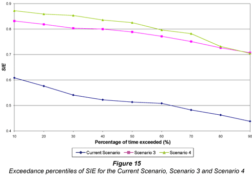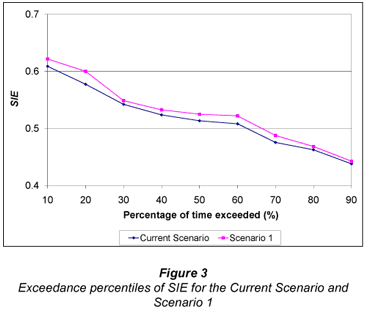 Percentiles of exceedance for annual periods were determined for ERC yield, SIE and NRH and are shown in Figs. 2, 3 and 4 respectively. Note that the levels of dam storage of the two systems are not included as changes in uniformity have no impact on water supply.