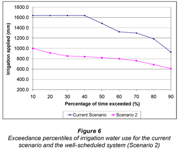 The reduction in water costs gained as a result of improved scheduling resulted in significant potential financial gains, as was illustrated in Scenario 2. However, it is argued that the benefit of improved scheduling was somewhat negated by poor uniformity, as average yields were only marginally higher for Scenario 2. Savings made by large reductions in water use resulted in a considerable increase in NRH.