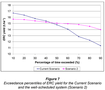 Figure 6 illustrates the considerable difference in water applied per season when comparing Scenario 2 and the current scenario. With the current scenario, 1 638 mm is applied on average per season if water supply is not restricted by supply from the dam, which occurred 40% of the time. With water supply constrained by simulating the dam hydrology, 1 428 mm of irrigation water was applied on average per season. In comparison, the Scenario 2 used only 816 mm on average per season, which equates to a water saving of R 815·ha-1 or R652 000 for the 800 ha irrigated area. A major implication of the improved water usage shown in Figs. 5 and 6 is that the irrigator can potentially irrigate a much larger area without suffering severe water shortages. Comparisons of ERC yield, SIE and NRH are shown in Figs. 7, 8 and 9 respectively.