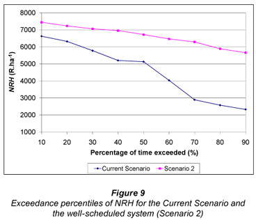 Examination of Figs. 7 to 9 shows that higher yields were obtained with the Current Scenario on 40% of the years compared to yields obtained using the Scenario 2. On average however, marginally higher yields (2.5%) were obtained with Scenario 2. This is explained by the irrigator using more water with the current scenario than with the improved schedule and yields frequently suffered as a result of the dam emptying in the current scenario. Furthermore, the potential benefits of improved scheduling are somewhat negated by the poor DU. Portions of the field were frequently under-irrigated, resulting in stress and reduced yield, whereas the current system applied excessive amounts so that even the drier portions of the field received adequate water. However, the improved timing of the irrigation applications resulted in a much higher SIE (40% on average) for Scenario 2, as is shown in Fig. 8. The slightly higher average yields and considerable reduction in water use resulted in an NRH that was, on average R1 850·ha-1 higher per season which translates into R1 480 000 for the 800 ha irrigated area. As was concluded in the previous section, the potential improvement in profit can be used assess the feasibility of making the associated improvements in scheduling.