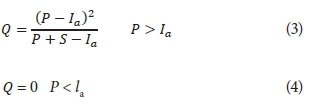 where Q is the direct runoff depth (mm), P is the depth of rainfall (mm), P is the depth of effective rainfall (mm) after runoff begins, S is the maximum potential soil water retention (mm) and I is the initial abstraction. Substituting Eq. 2 into Eq.1, the storm runoff depth is calculated from the expression: