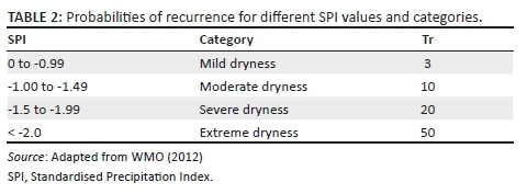 Six months SPI (SPI-6) was selected for drought frequency analysis. Six months SPI at the end of March gives a very good indication of the amount of precipitation that has fallen during the wet period (WMO 2012). The wet period in the study area is from October to March, and thus SPI-6 has the ability to show deficiency in rainfall, which is an indicator of drought. Standardised Precipitation Index is particularly suited to compare drought conditions among different time periods and regions with different climates (Cacciamani et al. 2007). Standardised Precipitation Index categories (Table 2) defined by WMO (2012) were used to classify drought years as they included Trs for drought events within each category.