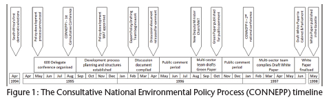 [T]he Consultative National Environmental Policy Process ... was widely viewed as the 'mother of all policy processes' and represented an exhaustive effort to bring on board voices that had hitherto been ignored. In so doing it was intended to shift environmental perspectives and paradigms in South Africa and develop an environmental policy that was relevant and appropriate to people's needs and priorities.