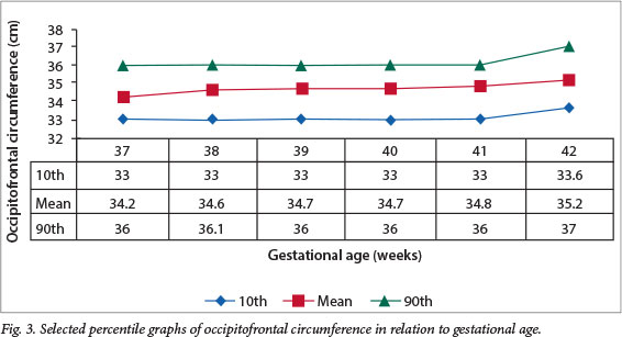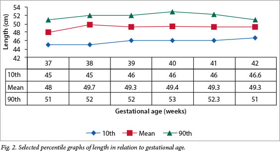 Figs 1 - 4 show the selected percentile graphs (10th, mean, 90th) for birth weight, length, PIs and OFC, respectively, at 37, 38, 39, 40, 41 and 42 weeks' gestation. Mean birth weight increased progressively until 41 weeks' gestation, showing a slight decrease at 42 weeks. Length also increased progressively, but showed a slight drop at 41 weeks before another slight increase at 42 weeks. OFC increased steadily all through the gestational age range, whereas the PI appeared to reach a plateau after 38 weeks.