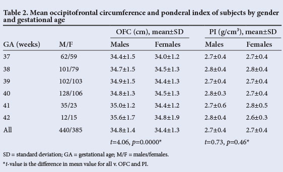 RESULTS: A total of 825 babies (440 males and 385 females) were studied. The overall mean birth weight (± standard deviation (SD)) of the study subjects was 3 233±539 g, the mean ±SD length 49.0±2.5 cm, the mean ±SD OFC 34.6±1.4 cm, and the mean ±SD ponderal index 2.7±0.4 g/cm3.