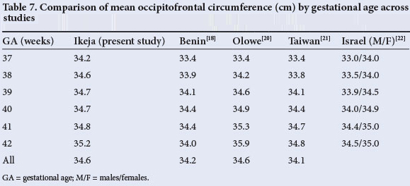 The mean head circumference of 34.6 cm in the current study is within the range of 33.1 - 35.2 cm in earlier reports[26,34] (Table 7). Comparison with other Nigerian and African studies is desirable, but limited by the fact that the focus in most earlier studies was almost exclusively on birth weight, and measurements of length and OFC were not reported.