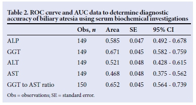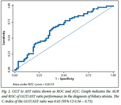There were significant differences in the proportions of patients with splenomegaly in the three groups, with more patients with biliary atresia presenting with splenomegaly compared with the other two groups. The GGT, AST and their ratio had different distributions across the groups, with GGT and the ratio to AST being higher in patients with biliary atresia (p<0.05). AST was significantly higher in the neonatal hepatitis group than in the other two groups (p<0.05). Of the biochemical features in the biliary atresia group, the C-indices of GGT (Fig. 1, Table 2), and of the GGT to AST ratio (Fig. 2, Table 2), were statistically significant because their 95% confidence intervals did not include 0.5.[13] The total and conjugated bilirubin were similarly raised across all groups.
